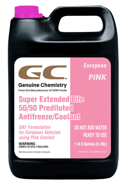 GC™ Super Extended Life 50/50 Prediluted Antifreeze/Coolant European Pink is an Organic Acid Technology (OAT) ethylene glycol-based coolant with an inhibitor package that uses (Non 2-EH) organic acid inhibitors. It does not contain any nitrites, amines, borate, silicate, or phosphate. It is specifically designed to be used in any European light/medium/heavy duty applications required Pink colored fluid to provide long-lasting, complete protection for all cooling system components.
